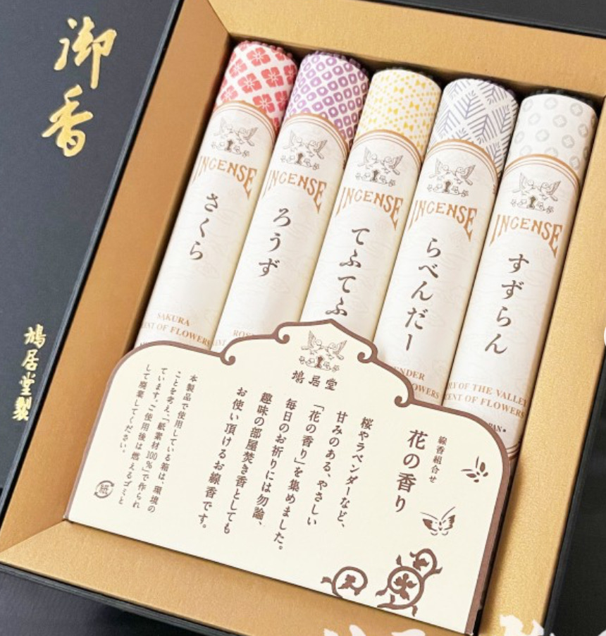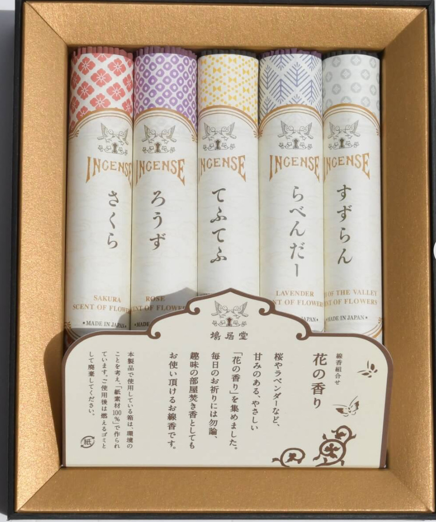 京都「鳩居堂」さんの現代香・お花の香りシリーズ5種を詰め合せたご贈答用のお線香。