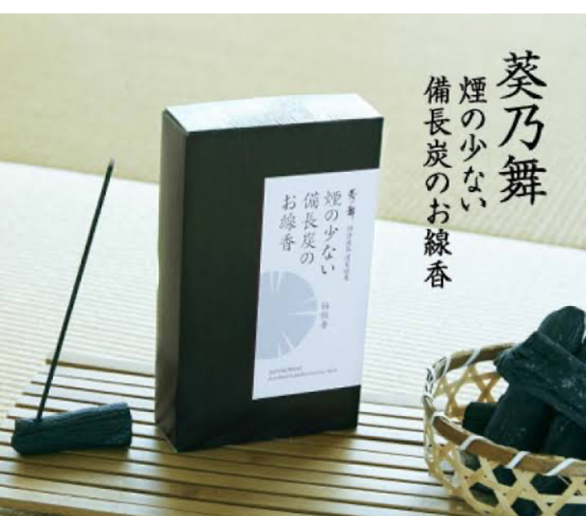 煙はほとんど出ない超微煙香「葵乃舞(あおいのまい) ・煙の少ない備長炭のお線香」。