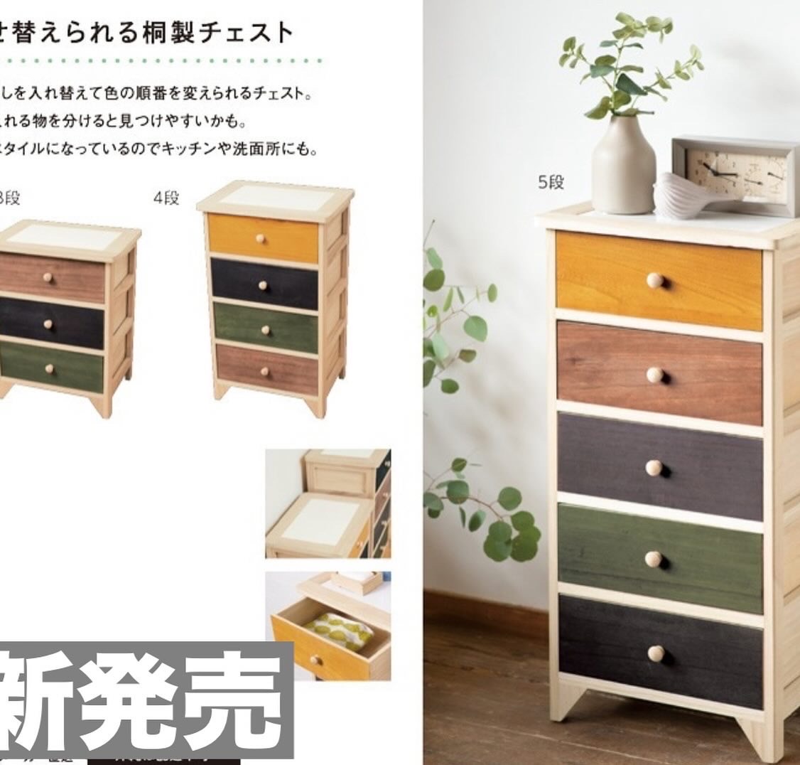 当店1番人気だった桐製チェストが復活!約3年程前に商品完売になりお客様のご要望も多かったシリーズ。リメイク販売にて、タイル天板付とサイズも3.4.5段と新たに5段サイズも加わり登場です